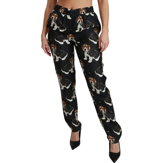 Dolce & Gabbana Black Puppy Dog Mid Waist Skinny Silk Pants