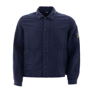 C.P. Company Linen Blend Shirt with Pockets. Blue colour, front fastening with buttons, two front patch pockets and pocket on the side, jacket model. Black logo applied on the sleeve. Composition: 51% Cotton, 49% Linen-Sku inside:24AP15