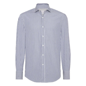 white and navy blue vertical stripe pattern long sleeves button cuffs classic collar front button closure Cotton shirt