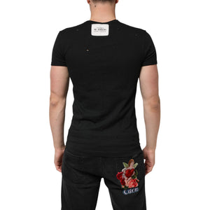 Dolce & Gabbana Black Cotton Tattered Logo V-Neck Men T-shirt