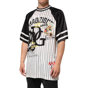 Gorgeous brand new, 100% Authentic Dolce & Gabbana T-shirt “Tradizione” oversized T-shirt from the men’s collection. Designed in a baseball jersey-inspired silhouette, this shirt features a striking pinstripe pattern contrasted by black raglan sleeves with sporty stripes. The front is decorated with vibrant, artistic graffiti-style graphics including the signature DG logo, religious and romantic imagery, and expressive text such as “Tradizione”, “Mon Amour”, “Amore”, and “God the”.