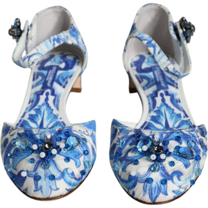 Dolce & Gabbana White Blue Majolica Print Ankle Strap Sandals Shoes