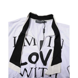 Gorgeous brand new, 100% Authentic Dolce & Gabbana t-shirt with wide ascot collar is made of thin jersey based on soft cotton and durable silk. The “I’m in love with love” print on the front shelf is a ready-made slogan for Instagram.