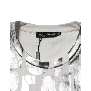 Dolce & Gabbana White Cotton Silver Metallic Slogan Print T-shirt