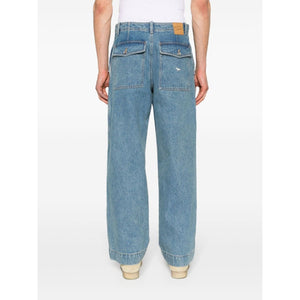 light blue cotton denim faux pocket detail logo patch to the rear embroidered logo to the rear low-rise belt loops button fly fastening two diagonal pockets to the sides two rear flap pockets wide leg Workwear denim cotton jeans Size and Fit - This piece fits true to size. We recommend you get your regular size. Model is 1,84m / 6ft 1in wearing size 32 (WAIST CM)