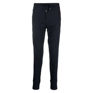 Midnight blue, cotton, jersey workmanship, rainbow motif, elasticated drawstring waist and tapered leg. Signature Stripe cotton sweatpants