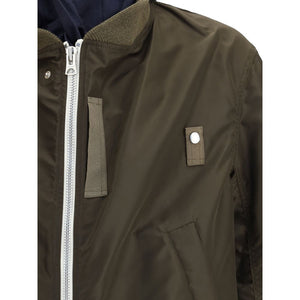 Sacai’s nylon bomber Jacket combines contemporary design and functional details. Featuring a ribbed knit collar, hem, and cuffs, it has a two-way zipper closure and snap-button tabs on the front. Welt pockets, side slits with snap buttons and a storage pocket on the sleeve add practicality, while an inside pocket completes the garment, ideal for urban and versatile style.