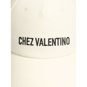 ivory white cotton canvas bowl crown five-panel construction 'Chez Valentino' embroidery eyelet vents curved peak adjustable strap to the rear Chez Valentino baseball cap