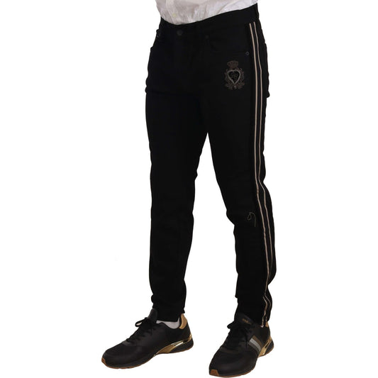 纹章刺绣修身黑色牛仔裤