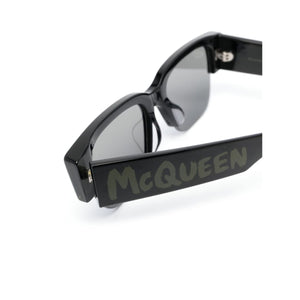 logo-print sunglasses from Alexander McQueen featuring black, logo print at the arm, blue tinted lenses, straight arms and curved tips. These glasses come with a protective case.. Graffiti sunglasses Size and Fit - Arm Length: 15.0 Centimetres. Bridge Width: 1.9 Centimetres. Lens Diameter: 5.4 Centimetres. Total Width: 14.4 Centimetres.