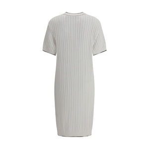 Brunello Cucinelli’s midi dress has a refined, casual design. The short-sleeved model is knitted with a ribbed crew neck that adds a touch of understated elegance. The contrasting colored hems enrich the garment with a modern and dynamic detail. A versatile dress, perfect for a chic and comfortable look, suitable for a variety of occasions.