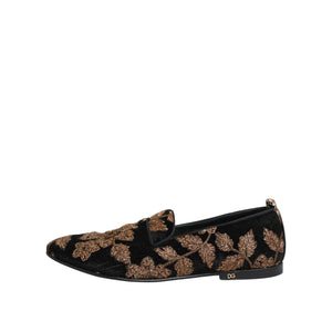 Dolce & Gabbana Black Floral Embroidery Men Loafers Shoes