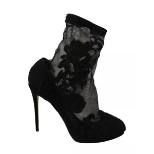 Dolce & Gabbana Black Tulle Stretch Floral Booties Shoes