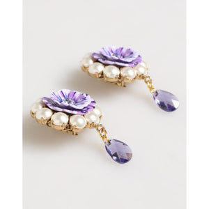 Dolce & Gabbana Purple Floral Crystal Pearl Drop Clip-On Statement Earrings