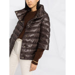 Padded design, straight hem, high neck, hidden front closure and 3/4 length sleeves. Color: Brown. Aminta nylon cape