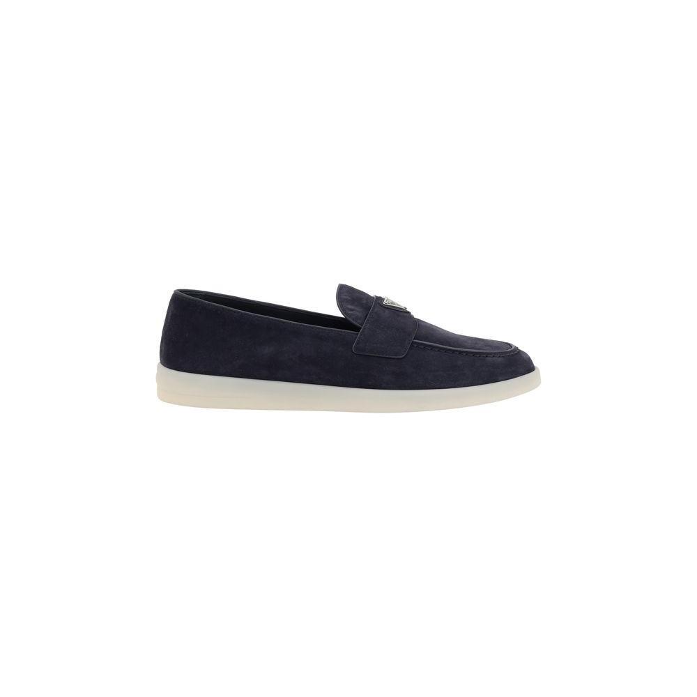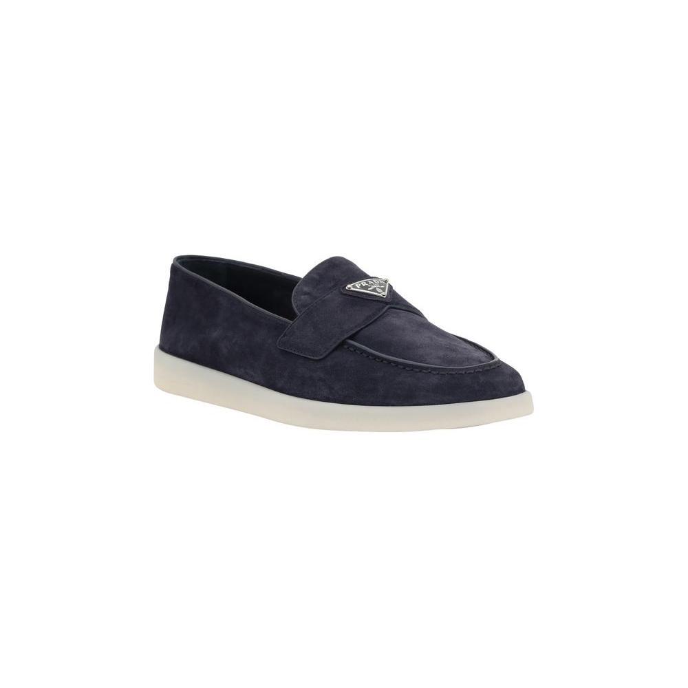 Prada’s leather Loafers feature an almond toe and a suede design that lends a touch of sophisticated elegance. The contrasting flat sole and front tray embellished with the brand’s iconic triangular plaque add a distinctive detail. The logo-embossed insole completes the look, making these loafers a refined and versatile accessory.