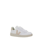 Calfskin V-12 Sneakers by Veja, lace-up front closure, heel counter with contrasting iconic brand monogram, round toe on front, contrasting iconic brand logo on side panels.